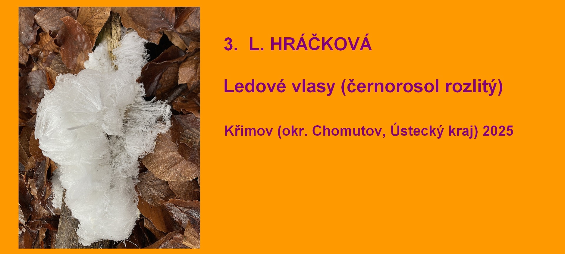 Třetí místo získala L. Hráčková za fotografii ledových vlasů, které za mrazu vytváří houba černorosol rozlitý (Exidiopsis effusa)